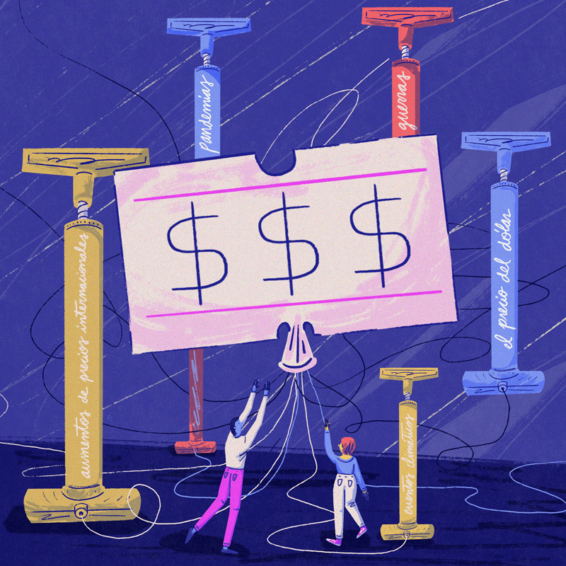 Si aumentan los costos de producción, aumentarán los precios también. Esto puede darse por varios motivos. Algunos provienen del exterior, de la economía internacional. Por ejemplo, si suben los precios de insumos o maquinarias que se importan para producir, o si suben los precios de bienes que se exportan pero también se usan en el país. No es raro que pase cuando hay una guerra, pandemias o eventos climáticos adversos. Otros motivos son más bien internos. Por ejemplo, si un sector clave llegó a su capacidad máxima de producción, aunque el resto de la economía tenga espacio para crecer, el “cuello de botella” de un sector impulsa la suba de precios al resto. Hay algunos sectores cuyos precios impactan sobre casi toda la economía. Hay un precio que es clave, porque vincula los precios internos y los externos, y es el tipo de cambio. Si por alguna razón el peso pierde valor frente a otras monedas (se devalúa o deprecia), una parte relevante de la producción ve subir sus costos.