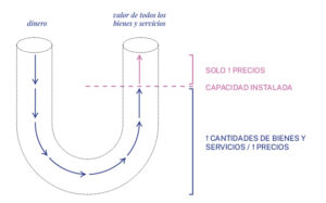 Ahora bien, esta hidráulica, que parece indiscutible, puede funcionar también al revés: que se llene el vaso de la derecha (bienes y servicios) y que esto presione el vaso de la izquierda (dinero). Esto hace que las flechitas del tubo circulen en la dirección contraria. ¿Cuáles pueden ser las causas de un aumento en la cantidad de bienes y servicios y/o de los precios en una economía? Muchas, acá comentamos apenas algunas.