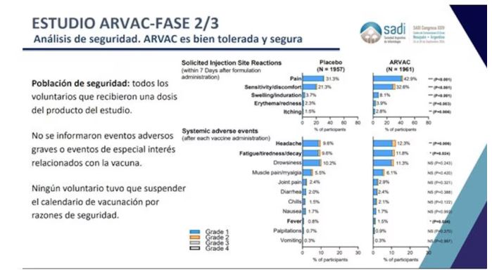 Respecto a la vacuna ARVAC, los resultados de seguridad del estudio de Fase III demuestran no solo la muy baja incidencia de eventos adversos sistémicos reportados, sino además que en la mayoría de casos la vacuna no se diferencia del placebo.