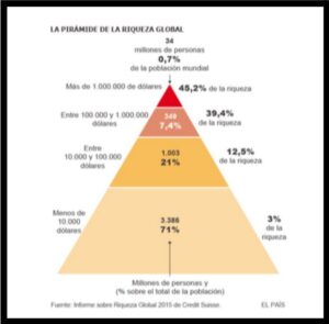 El uno por ciento más rico posee más riqueza que el 95% de la humanidad. Las 3 mil familias más opulentas ostentan el 13 por ciento del Producto Bruto Global, una suma equivalente a 14 billones de dólares. Hace cuatro décadas, esas mismas 3 mil familias controlaban el 3 por ciento del Producto Bruto. Gracias a las normativas estatales que lo ha beneficiado, ese pequeño grupo de multimillonarios supera ampliamente en riqueza al 99.99 por ciento restante. Mientas esa rapacidad se lleva a cabo, casi la mitad de la población mundial se ubica debajo de la línea de pobreza, sobreviviendo apenas con siete dólares diarios. En términos de patrimonio, el uno por ciento más rico tiene tanto patrimonio como todo el resto del mundo junto. La brecha, lejos de acortarse, se ha ampliado en forma sistemática desde el inicio de la Gran Recesión de 2008 debido a normativas institucionales que lo han permitido y viabilizado. Más del 70 por ciento de la población mundial (unos 2500 millones de personas) posee apenas el 3 por ciento de la riqueza.