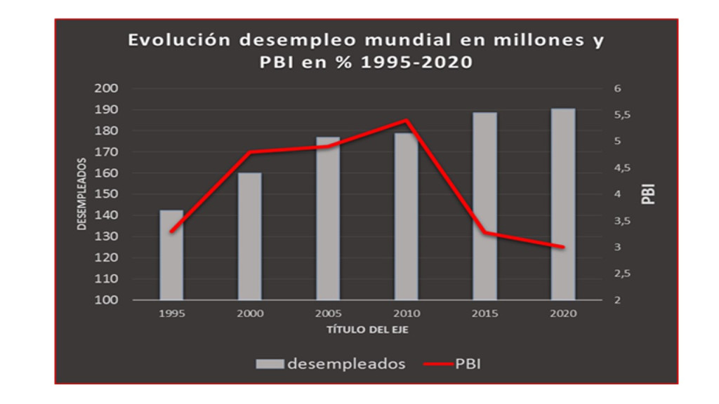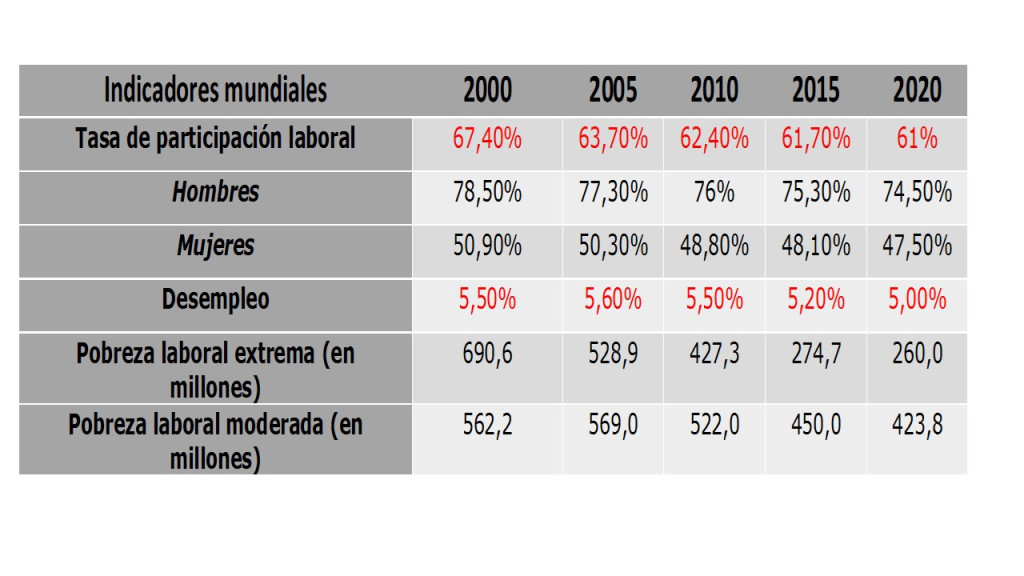 Según la Organización Mundial del Trabajo (OIT), de los 5.700 millones de personas en edad de trabajar están empleadas 3.300 millones de personas, unos 2.070 millones son jubilados o estudiantes que no trabajan, 190 millones son desempleados y 140 millones son desempleados que no buscan trabajo.