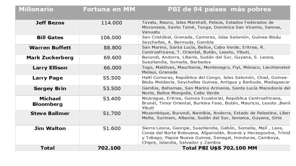 En 2006, cuando escribí la primera versión de este artículo, los diez mayores millonarios tenían el mismo patrimonio que el PBI de 48 países pobres. Hoy esta relación, como vemos en el cuadro siguiente, se duplicó y se necesita el PBI de 96 países para igual el patrimonio de los diez megamillonarios.