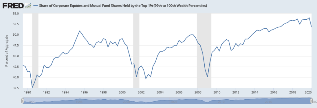 Wall Street cerró su mejor agosto desde 1984 de la mano del crecimiento de las empresas tecnológicas. Sin embargo, el mercado bursátil no es la economía: más de la mitad de todas las acciones, inversiones en fondos mutuos pertenecen al 1% de los estadounidenses, mientras que la mitad inferior de la población solo posee un 0,7% del mercado. Los indicadores que tengan que ver con la economía real, están apoyados sobre los rangos de ingresos medio que se encontrarían en el percentil debajo del 50%, como muestra la FED, ya sea en la participación en las hipotecas, los créditos al consumo, etc.