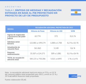 - Si se aplica ese 0,11 % al PIB proyectado para 2022 en el Proyecto de Ley de Presupuesto, el monto de la exención sería de 65.774 millones de pesos, equivalentes al 10 % del presupuesto proyectado para atender la salud pública, el 35 % del gasto proyectado para financiar ciencia y técnica, el 115 % del presupuesto para el Ministerio de Justicia y Derechos Humanos o más de 6 veces el presupuesto para el Ministerio de las Mujeres, Género y Diversidad.