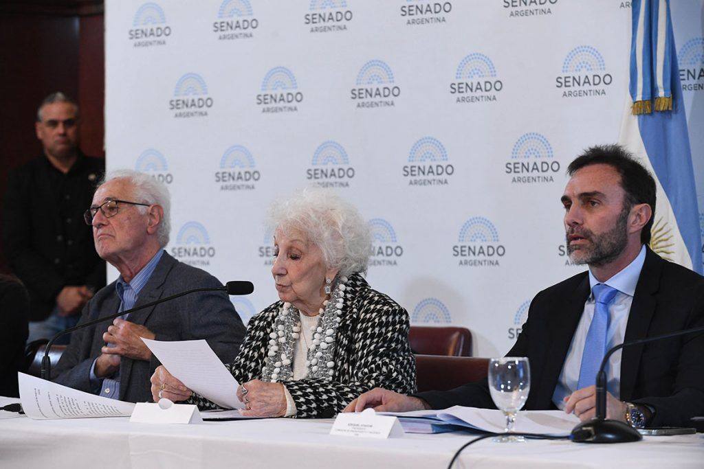 En el Salón Azul, preocupada, Carlotto les pidió a los senadores «memoria» para honrar compromisos con el pueblo. En ese sentido, se refirió a la histórica institución que preside resaltando los artículos 3 y 6 de la Ley de Bases, que habilita al Gobierno nacional a eliminar organismos públicos. En particular, a la posibilidad de la eliminación del Banco de Datos Genéticos y la Comisión Nacional por el Derecho a la Identidad (CONADI). Se trata de instrumentos que han sido necesarios en el marco de la lucha por la búsqueda de los nietos apropiados ilegalmente durante la dictadura militar.