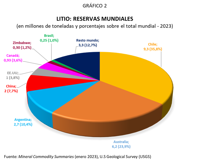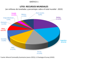 El Servicio Geológico de Estados Unidos (USGS por sus siglas en inglés) en su Sumario de los Comodities Minerales 2023, calcula los recursos mundiales de litio en 98 millones de toneladas (Tn) y las reservas en 26 millones de Tn. distribuidos del modo que muestran los Gráficos 1 y 2.