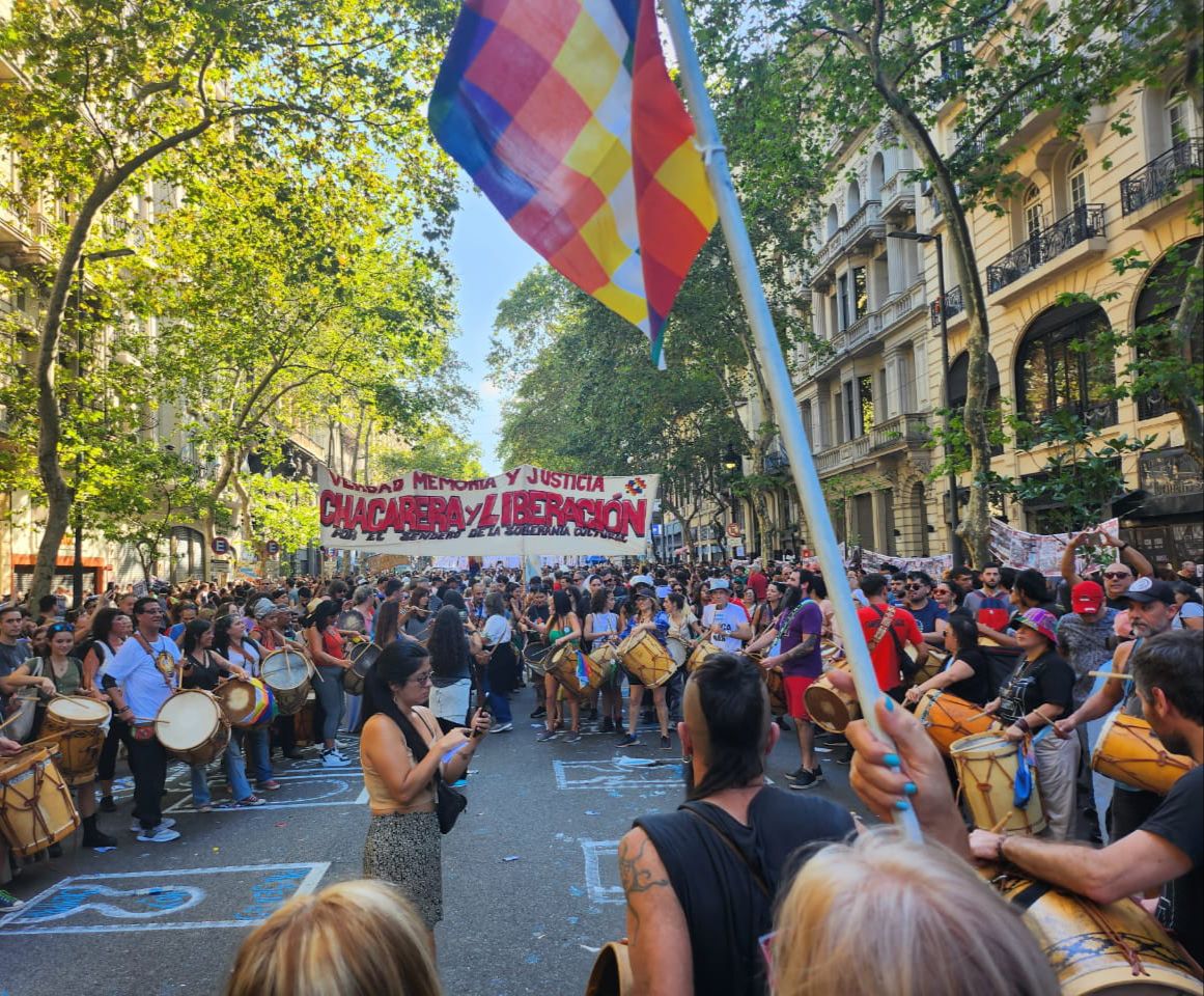 Innumerables intervenciones, se abrían paso en la multitud: pinturas, carteles, esculturas, grafitis, danzas, pancartas, cantos, cocina, radios, música, percusión. marionetas gigantes, murgas, instalaciones. Formas diferentes que desde los corazones defienden la Memoria, la Verdad y la Justicia.
