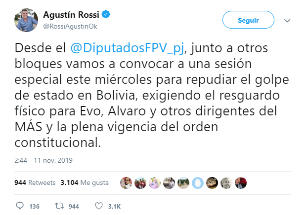 «Juntos a otros bloques vamos a convocar a una sesión especial este miércoles para repudiar el golpe de Estado en Bolivia, exigiendo el resguardo físico para Evo (Morales), Álvaro (García Linera) y otros dirigentes del Más en plena vigencia del orden constitucional», tuiteó Rossi esta mañana.