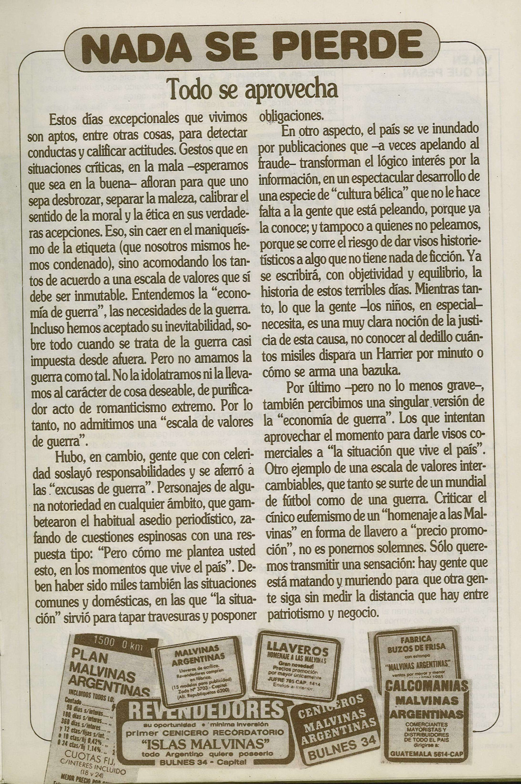 No obstante, fueron varios los medios gráficos y radiales que resistieron a ese relato oficial. La revista Humor Registrado, exponente de la oposición cultural y política a la última dictadura, publicó varias tapas entre abril y junio de 1982 que denunciaban los vínculos internacionales, el entramado económico y las decisiones de la Junta Militar en el marco del conflicto.