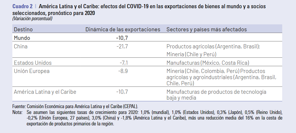 América Latina, y seguramente Sudamérica, tendrá un impacto económico mayor que otras áreas ya que depende de la actividad económica de sus principales socios y los canales de transmisión económicos son inmediatos. Los precios de los commodities se derrumbarán y su caída provocará un mayor deterioro de los términos de intercambio dependiente de las exportaciones de bienes primarios (cuadro 2).