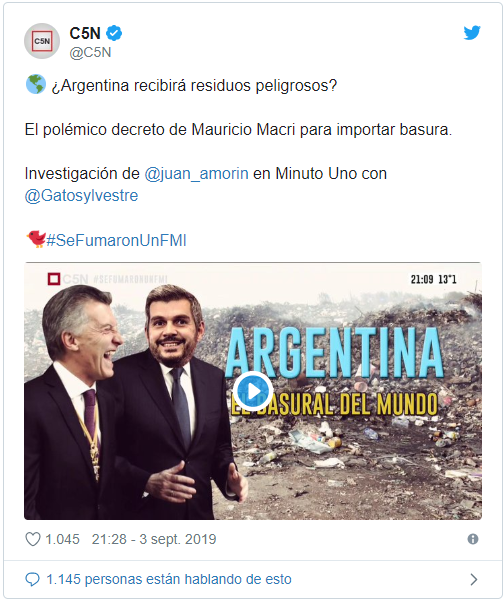 Así Macri flexibiliza la ley para que los empresarios puedan importar basura del mundo. «Desechos de papel y cartón, la chatarra ferrosa, la chatarra de aluminio, los desechos de material plástico y el cascote de vidrio, entre otros”, especifica el decreto 591 de 2019.