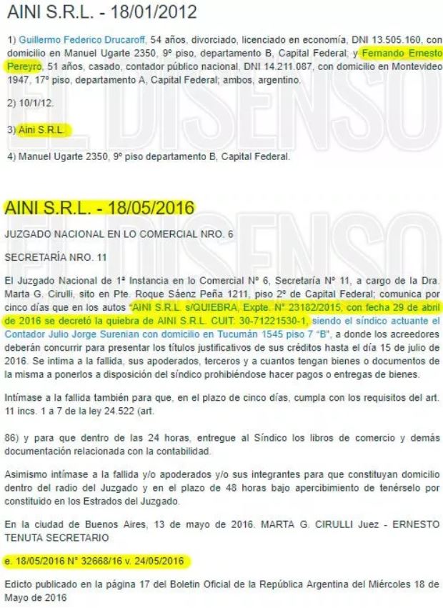 El 18 de enero de 2012, Pereyro creó la empresa AINI SRL junto a Guillermo Federico Drucaroff, el Subsecretario de Compre Argentino y Desarrollo de Proveedores en Ministerio de Producción de la Nación. A los pocos meses de haber ingresado a la función pública, el Juzgado Nacional de 1ª Instancia en lo Comercial Nº 6 decretó la quiebra de la empresa.