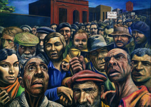 “Manifestación” y «Desocupados”, ambas de 1934, reflejan la crisis de la década del 30, tras el golpe de Estado que derrocó al presidente radical Hipólito Yrigoyen.