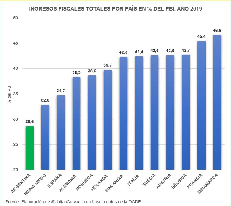 ¿Qué es el EBITDA? Es el cálculo de ganancias de las empresas antes de que las empresas paguen los impuestos que tienen que pagar por lo que ganaron. Cuando voy a mirar, por ejemplo, el EBITDA, o sea las ganancias de una de las empresas más importantes del país, no voy a dar más datos porque si no se van a dar cuenta, averigüen si quieren. La variación entre el 19 y el 21 fue un crecimiento del 412,6%. Repito, repito: 412,6%. EBITDA, ganancia antes de pagar impuestos. Y voy a hacer otra empresa también de insumos difundidos porque ahí tenemos los dos grandes problemas: alimentos… después voy a hablar de los textiles como cuello de botella… alimentos e insumos difundidos. Bueno, en insumos difundidos una de las más importantes, si no la más, les doy un poquito más de pistas. Tibio, tibio. Una importante, muy importante, muy, muy importante entre el 19 y el 21, 224,3% de EBITDA. Ahhh, ya sé lo que estarán diciendo algunos empresarios que me están mirando. Claro, pero eso es antes de pagar impuestos. Ah, mirá qué bien. Porque ahora viene la tercera gran excusa que escuchamos en los medios de comunicación: “¡la presión tributaria, los impuestos que pagamos, qué desastre! Que no podemos… Bien, veamos… yo les decía que la Argentina es este país que Simón Kuznets establecía como una economía especial. Impuestos y la presión tributaria. Dinamarca debe ser el país de mayor presión tributaria con un 47%, le sigue Francia, creo que después Bélgica, pero, la Argentina está lejísimo de eso.