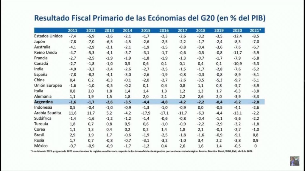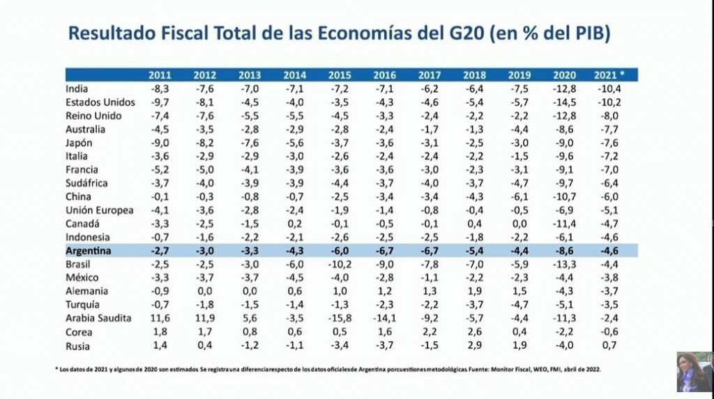 De la emisión no voy a hablar porque hablé en Chaco y mostré el gráfico donde no se había incrementado la emisión. Pero hoy voy a hablar del déficit fiscal porque me traje unos numeritos ahí, a ver… G20, ustedes saben, el G20 del cual Argentina forma parte, se integra por países desarrollados y emergentes. Nosotros somos parte de los emergentes. Miren: ahí está el resultado fiscal primario de las economías del G20. Miren en la posición de déficit que está la Argentina, decimotercera, 13, el número de la yeta. Ahí estamos. Fíjense todos los países anteriores. Todos los países anteriores tienen muchísimo más déficit que nosotros. Ese es el primario. Fíjense Estados Unidos, ese se lleva las palmas. Estados Unidos se lleva las palmas. El mayor déficit fiscal lo tiene Estados Unidos. Y no de ahora del XXI, vienen históricamente con déficit fiscal. Lo mismo países como Francia, como Japón, déficit fiscal. ¿Me ponen el mapita? Miren. Este es el mapita. No hace falta que lo explique, los rojos, los más intensos los menos intensos tienen que ver con los países del mundo que tienen resultado fiscal primario. ¿Qué es primario? Antes de pagar la deuda, antes de pagar los servicios financieros de la deuda tienen ese resultado. Vamos con el resultado fiscal definitivo después de pagar deuda por favor que son números también… columna. Ahí lo tenemos, otra vez decimotercero. Fíjense Estados Unidos otra vez récord en materia de déficit fiscal total. Todos los demás países que nos anteceden, estamos hablando de India, Estados Unidos, Reino Unido, Italia, Japón, Francia, Sudáfrica, China, Unión Europa, Canadá, Indonesia, etc.
