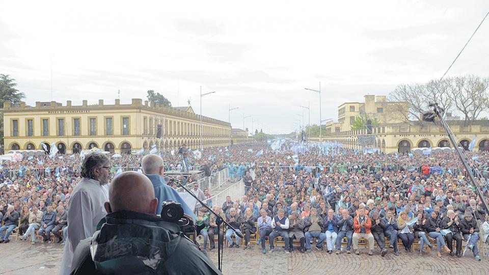 Bajo un cielo blanco y una lluvia caprichosa, una multitud que los organizadores cifraron en 800 mil personas se movilizó a la Basílica de Luján para un oficio interreligioso con la consigna de “Paz, pan y trabajo”. La convocatoria del Frente Sindical para el Modelo Nacional y más de setenta organizaciones gremiales, políticas y sociales buscó graficar el rechazo a la recesión implementada por el Presidente Mauricio Macri y el reclamo de cambios a la política económica.