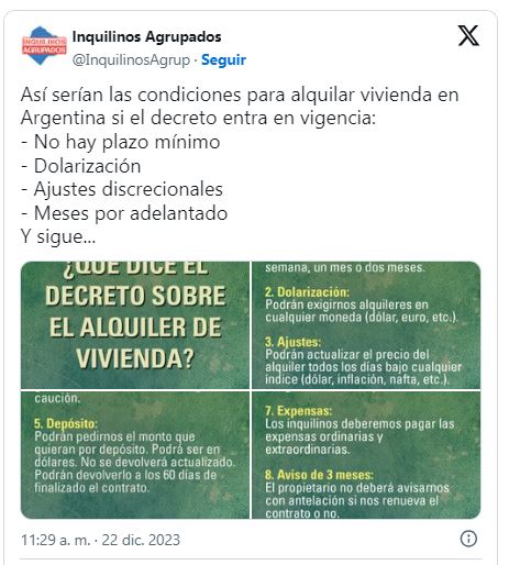 En la espontaneidad de esta salida a la calle, sin embargo, sobresale la lucha articulada de lxs inquilixs. No por casualidad la primer ley nombrada en la lista de derogaciones. Al día siguiente esas mismas protestas se multiplicaron en varias ciudades del país. Esto no solo demuestra que el 44% que no lo votó no está dispuesto a una espera pasiva sino que también anticipa la aceleración del descontento en votantes de Milei. El enojo convergerá con la desilusión en la medida en que las promesas de estabilización y de que el ajuste lo pagaría la casta se vuelvan diametralmente distantes de los esfuerzos de la vida cotidiana.
