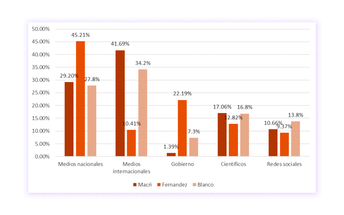 Para los oficialistas, la fuente más elegida fueron los medios de comunicación nacionales, seguidos por el gobierno, luego los científicos, los medios internacionales y por último las redes sociales. Para los opositores, la fuente más confiable fueron los medios internacionales, luego los nacionales, los científicos, las redes sociales y por último, el gobierno. El mayor contraste entre opositores y oficialistas se observa en la confianza o desconfianza en los medios internacionales como fuente: lo eligió el 41,69 % de los opositores, frente al 10,41 % de los oficialistas. También contrasta el nivel de confianza en el gobierno como fuente: lo elige el 22,2 % de los oficialistas, contra el 1,4% de los opositores. Estos datos refuerzan el panorama antagónico del sistema mediático y la polarización en relación con el consumo de información durante la pandemia.