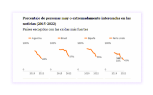 Al mismo tiempo, detectamos que el porcentaje de gente que dice estar muy interesada en las noticias ha disminuido a lo largo del tiempo en todos los mercados: es una tendencia que se aceleró a pesar de la pandemia. En 2022 el interés por las noticias fue menor en la gran mayoría de los países. En algunos como Argentina, Brasil, España y el Reino Unido estas caídas se acumulan desde hace tiempo.