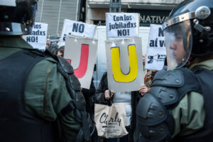 Patricia era enfermera. Durante la pandemia estuvo en la línea de fuego, vacunando en las villas de Buenos Aires. Con poco más de sesenta años, ahora está jubilada y cobra la mínima: 234.540 pesos. Y está en la línea de fuego otra vez. Apoyada contra un farol en la esquina de Irigoyen y Entre Ríos observa en silencio. Ve pasar la fila de robocops verdes que marchan al acecho hacia la zona del anexo del Congreso. Es la antesala de la represión que está por desatarse sobre la asamblea de jubilados. Patricia tiene los ojos delineados, sombra rosa pastel y la presencia de una aplanadora. Está sola, contiene la rabia, le tiemblan los párpados, aprieta la cartera contra su pecho: