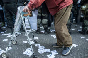 Petisa como es, aprovecha su tamaño para meterse entre las filas de gendarmes. Es una señora de 80 años con su sweater turquesa y su morral tejido contra el mundo. Les muestra sus zapatillas agujereadas.