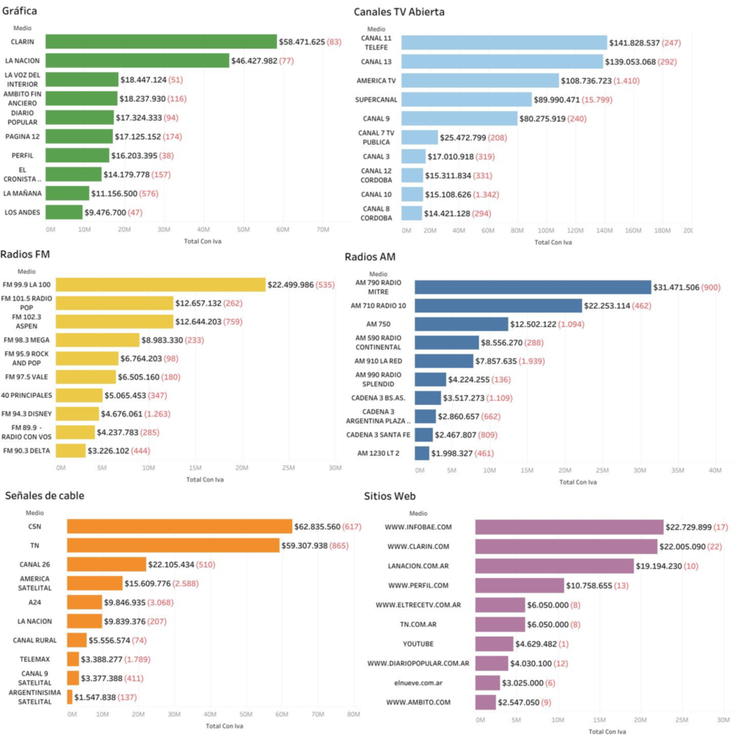 En general, y teniendo en cuenta los montos recibidos por cada medio, se destaca una continuidad en otorgar mayor dinero a los medios que mayor audiencia tienen. Esto sucede con Telefé en televisión abierta, con Clarín en gráfica, La 100 en FM, Mitre en AM y hasta con C5N en señales de cable.