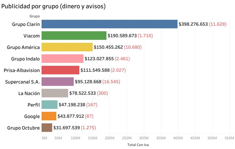 Otro dato que se destaca es el de los 322 millones de pesos pautados gracias al mecanismo de canje de deudas. Los grupos que mayor cantidad de publicidad percibieron por este ítem –que intercambia deudas impositivas por espacios publicitarios- fueron el Grupo América, Cadena 3, Publicidad Sarmiento (Mendoza), los servicios de radio y televisión de la Universidad Nacional de Córdoba y Telecentro.