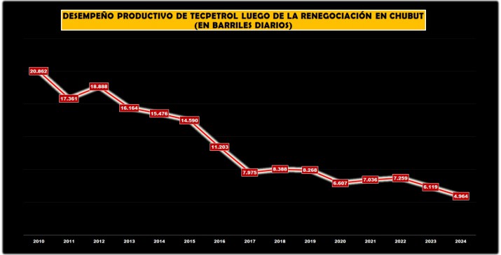 Lo que viene haciendo Tecpetrol en Chubut es un «petrocidio» con un brutal abandono de las áreas concesionadas que tiene en la provincia desde 1991. Su desenvolvimiento en los últimos 15 años viene en caída libre en materia productiva, dilapidó reservas de crudo por no realizar exploración y en el 2024 batió el récord de desinversión desde que desembarcó en Chubut.