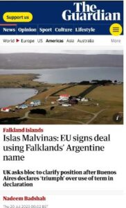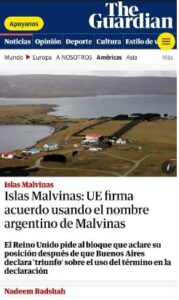 El titular traducido al castellano del diario The Guardian lamentando como la Unión Europea llama ahora Islas Malvinas en lugar del término «Falklands» que usa el Reino Unido.