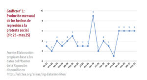 Los datos más contundentes del informe corresponden al capítulo sobre represión estatal. Entre el 10 de diciembre de 2023 y el 31 de mayo de 2025 se contabilizaron al menos 73 protestas reprimidas.