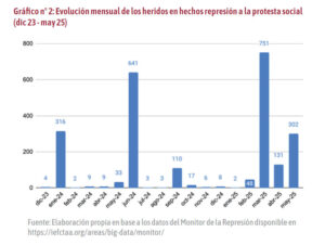 La virulencia represiva alcanzó su punto máximo en 2025, particularmente en las acciones contra las tradicionales rondas de los miércoles que desde 2017 realizan organizaciones sociales frente al Congreso. Durante los primeros cinco meses del año, las fuerzas de seguridad reprimieron 12 de las 20 movilizaciones semanales, dejando un saldo de 130 detenidos y 1.206 heridos, incluyendo niños y periodistas cuyas herramientas de trabajo fueron destruidas intencionalmente.