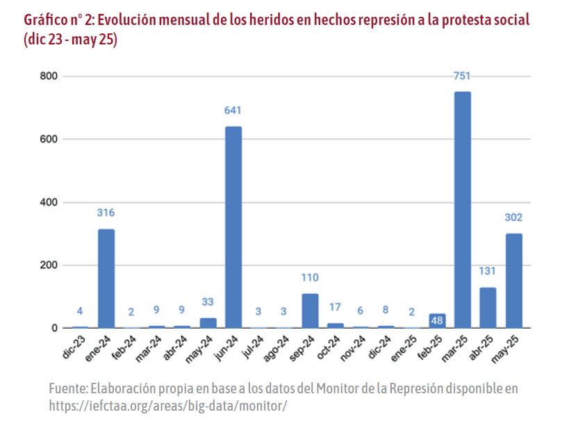 En esas represiones se registra un saldo de al menos 2.395 personas heridas (1.162 durante 2024 y 1.233 en los primeros cinco meses de 2025) y 277 detenidas. Estas cifras reflejan una clara intensificación de la violencia en el último período.