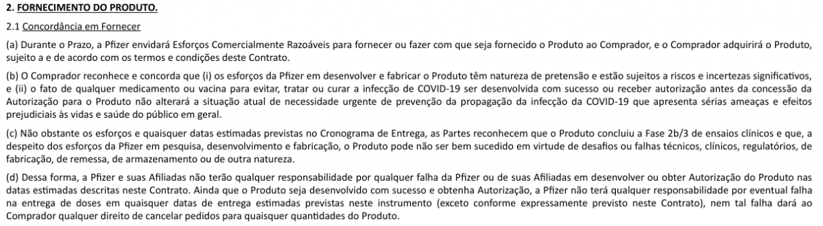 En el contrato que firmaron el Estado brasilero y Pfizer, el laboratorio asume que hará “Esfuerzos Comercialmente Razonables” para la entrega de vacunas. Según el propio contrato este tipo de esfuerzos son realizados para alcanzar “un objetivo semejante a su interés comercial bajo circunstancias semejantes y considerando los riesgos relevantes, incertidumbre, límites y desafíos del desarrollo, fabricación, comercialización y distribución de un nuevo producto de vacuna de Covis-19, considerando los siguientes factores: cuestiones reales y potenciales de seguridad y eficacia, novedad, perfil del producto, la posición de exclusividad, el entonces actual ambiente competitivo para tal producto, el ambiente regulador y situación del producto”, entre otros, así como la capacidad para producirlo y obtener los productos necesario para ello. Esto quiere decir que Pfizer no sabe cuándo entregará conforme la situación actual y que una variable a ser considerada al momento de la entrega es si tienen la exclusividad del producto en el mercado.