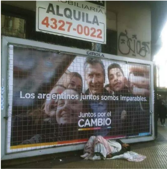 políticas de Estado. A los pies de la postal inmunda adormece su olvido un hombre pobre,