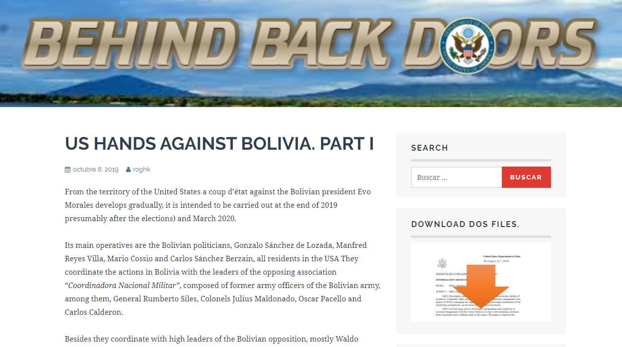 El analista internacional Alfredo Jalife Rahme, dio a conocer el texto en inglés del sitio Behind Back Doors en el que se explicó con varias semanas de anticipación los detalles, con nombres y apellidos de los involucrados, de la planificación desde los EEUU del presente golpe en Bolivia.