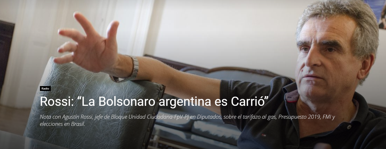 Entrevista en #NoNosQuedaOtra a Agustín Rossi, Diputado Nacional por Santa Fe y Presidente del Bloque de Diputados Unidad Ciudadana-FpV-PJ, sobre la discusión del Presupuesto 2019, el aumento de las tarifas de gas y la situación política regional en torno a las elecciones en Brasil. El FMI dictando política, el tarifazo sin fin de Cambiemos, “la Bolsonaro argentina es Carrio”, y mucho más.