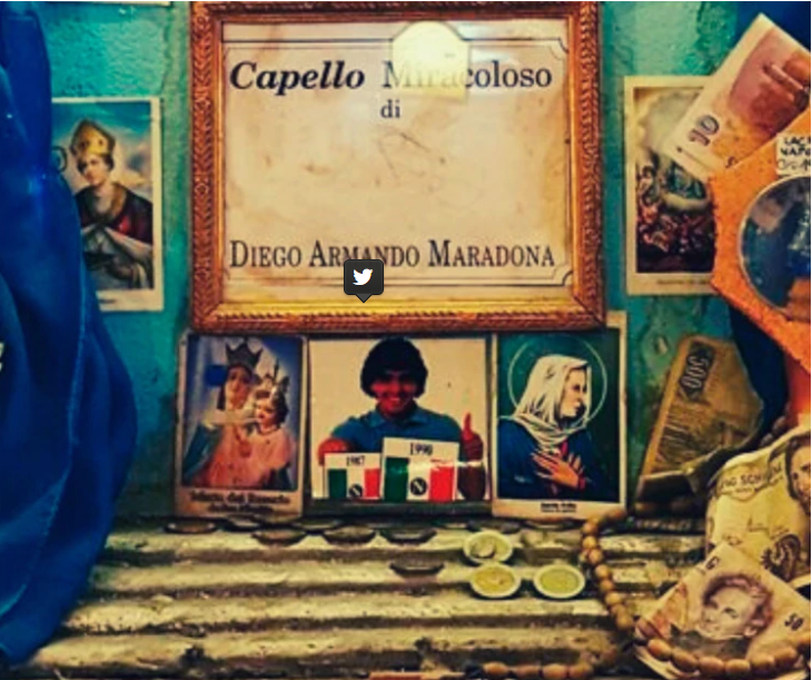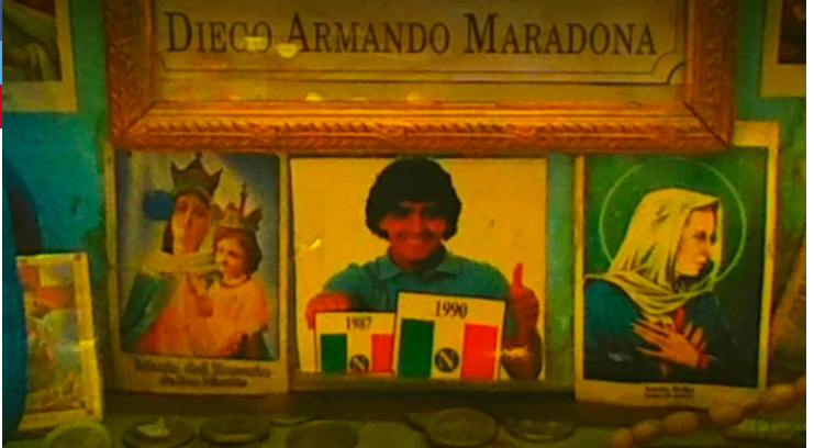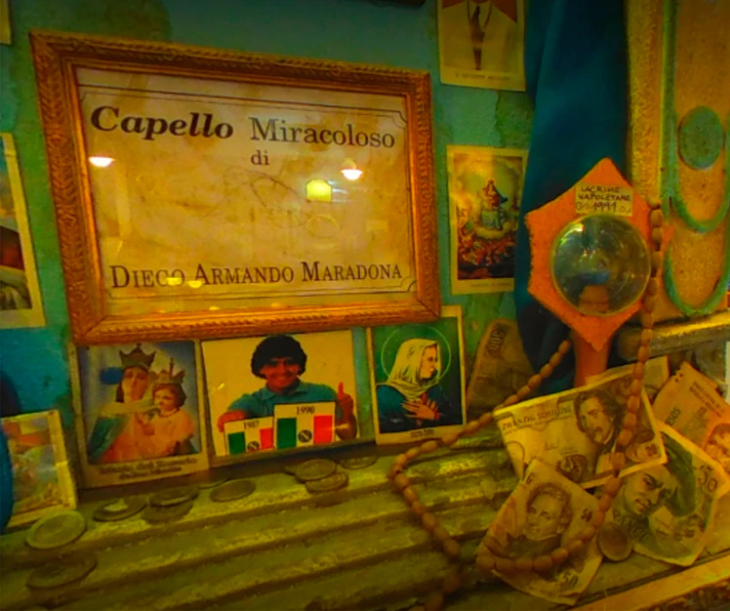 Lo fue entonces por ejemplo el capocómico Totó, o el mismísimo Maradona, y desde hace 30 años lo es también Santa Evita, la patrona de los oprimidos. Los bares, que son las catedrales populares de la sociedad napolitana, le levantan pequeños altares con su estampita. Le «rezan» sin oraciones y se besan la mano para luego tocar la imagen de perfil con el velo blanco como un rito que da inicio al día de trabajo. En parte para que los proteja, pero también, como manifiestan los empleados de más de 60 años de edad, testigos de la trayectoria de Maradona y, por ende, empapados de la cultura e historia argentina, por una sociedad más justa. El sur de Italia siempre fue una región postergada y fue El Diego quien internacionalizó esta situación que todavía hoy se siente.