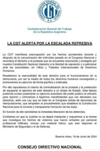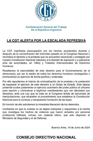 «Esta falacia pretende ocultar justamente un ejercicio autoritario del poder público al utilizarlo para reprimir y criminalizar a legítimos manifestantes que ven afectados sus derechos, ante una Ley que se trata en el Congreso teñida de denuncias de manipulaciones, que atropellan el procedimiento que establece la Constitución Nacional para la correcta y transparente formación de las leyes», agregó el Consejo Directivo Nacional de la CGT.