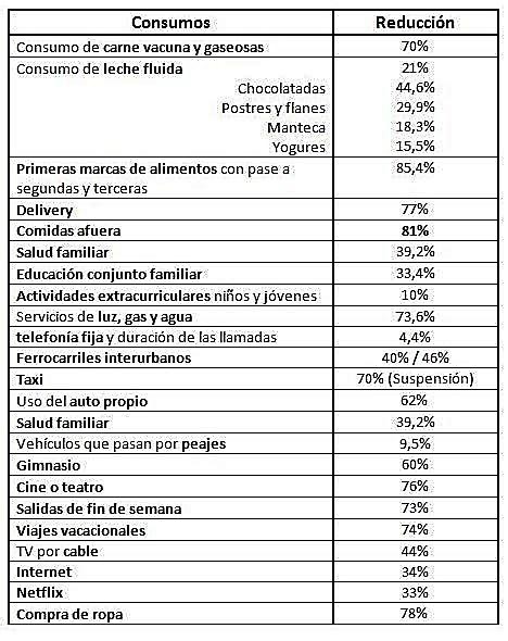 Entre los componentes de ese repertorio de “pérdidas” figuran desde el uso de taxis hasta la suscripción a Netflix -con la tercera temporada de la Casa de Papel incluida- o el “pack fútbol”, desde el uso del auto propio y el disfrute vacacional hasta las salidas de fin de semana o la concurrencia a gimnasios, pasando, incluso, por los viajes en trenes interurbanos, el consumo de carne vacuna, gaseosas y primeras marcas de alimentos, además de lo destinado a salud familiar y educación.