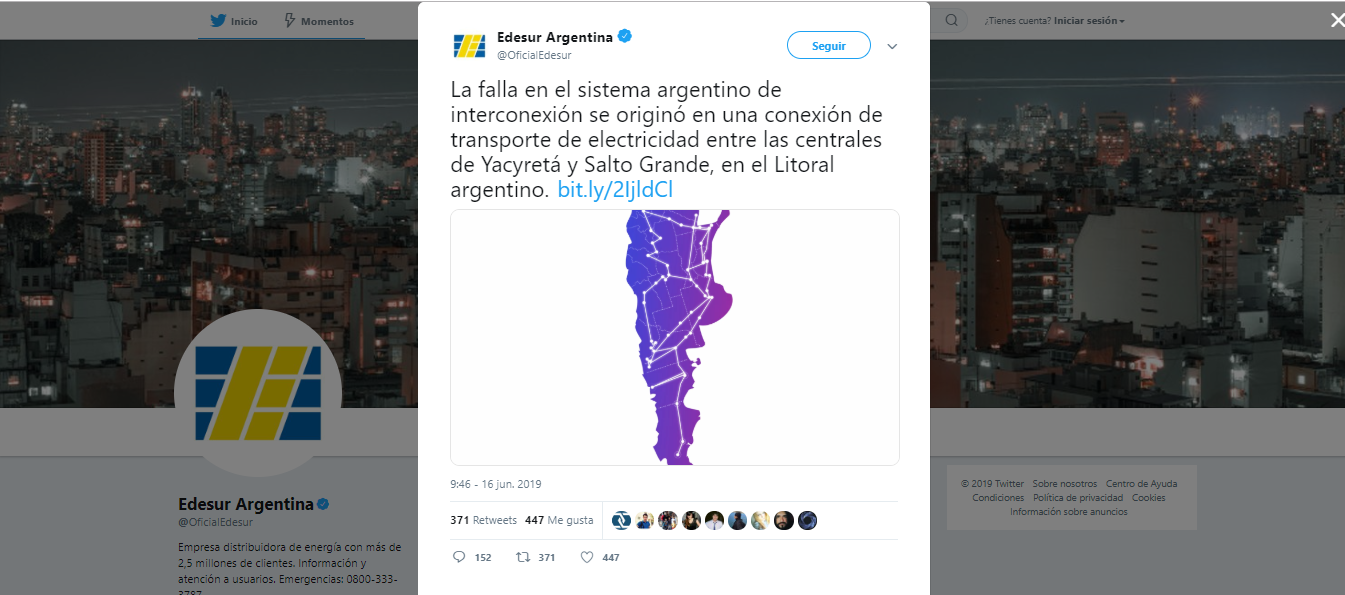 Edesur, la compañía encargada de dar servicio a la zona sur del país que tiene más de 2,5 millones de clientes, señalada inicialmente como responsable del problema emitió un comunicado aclarando que se trataba «de un fallo en el sistema argentino de interconexión (SADI), ajeno a nuestra empresa». Un fallo que dejó sin luz «a toda la Argentina y países limítrofes». A raíz de esta contingencia, Edesur montó su plan operativo de emergencia para hacer frente a la situación excepcional. Advirtió, además, que «la recuperación total del servicio llevará todo el día hasta que se logre el normal funcionamiento del sistema interconectado».