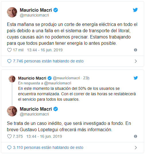 La reacción del presidente Mauricio Macri se hizo esperar casi siete horas. A las 13.44 horas (18.44 horas en España), escribió en su cuenta de Twitter: «Esta mañana se produjo un corte de energía eléctrica en todo el país debido a una falla en el sistema de transporte del litoral, cuyas causas aún no podemos precisar. Estamos trabajando para que todos puedan tener energía lo antes posible». En ese momento, según apuntó el presidente argentino, «la situación del 50% de los usuarios se encuentra normalizada. Con el correr de las horas se restablecerá el servicio para todos los usuarios». A lo que añadió, en un tercer tuit, que se trataba de «un caso inédito, que será investigado a fondo».