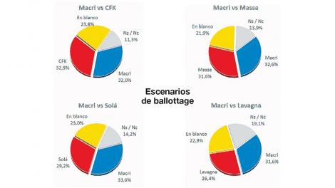 La conformación de un frente electoral es una opción muy concreta que, además, seducir a la mayor parte de los argentinos –afirma el titular del CEOP–. Hay un 43 por ciento que está de acuerdo con la unidad, un porcentaje altísimo. Pero hasta el momento no se ha materializado ni la posibilidad de una segunda vuelta aparece nítida. Frente a esta situación potencial se incorporan al cuestionario de esta encuesta cuatro escenarios de ballottage: en todos Mauricio Macri por Cambiemos y por otro lado, alternativamente, un CFK, Sergio Massa, Felipé Solá y Roberto Lavagna. Podría afirmar que cada escenario se divide por tercios: un tercio para Macri, otro tercio para el candidato opositor y un último tercio para los indecisos. Por lo visto la llave del eventual ballottage descansa en los indecisos que son los que en definitiva dicen que votarán en blanco o no contestan. Esos indecisos al final se vuelcan por un lado y por lo que vemos mayoritariamente hacia la oposición ”.