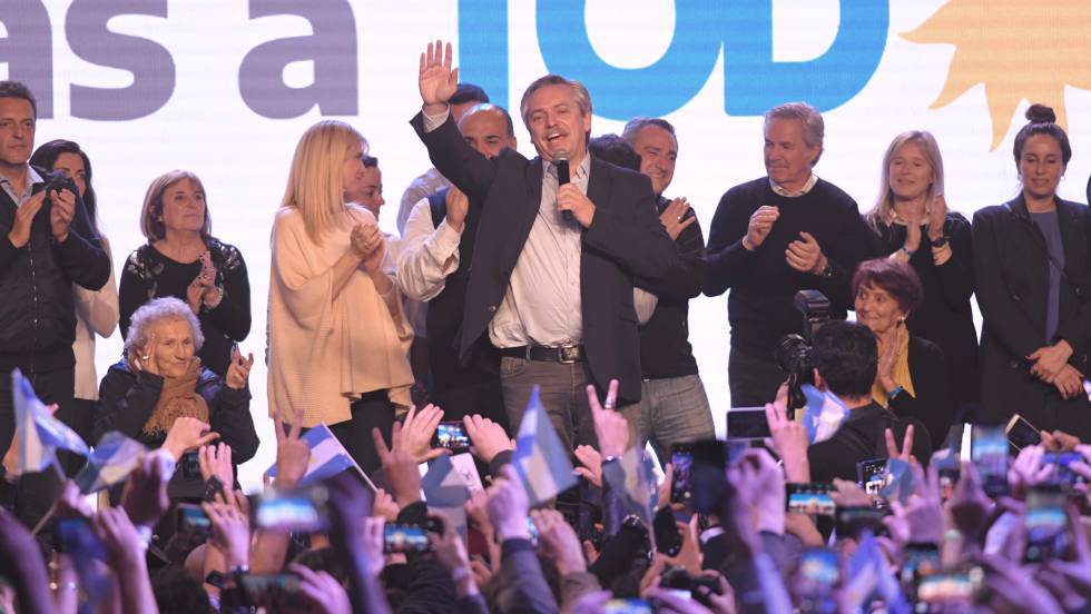 Alberto Fernández infligió una durísima derrota al presidente Mauricio Macri en las primarias argentinas. Con casi el 90% de los votos escrutados, y tras un inexplicable retraso de más de cuatro horas en la difusión de los primeros datos, el Ministerio del Interior anunció que el Frente de Todos peronista había obtenido más del 47%, frente al 32% de la coalición en el Gobierno, Juntos por el Cambio. Alberto Fernández y su compañera de candidatura, la expresidenta Cristina Fernández de Kirchner, parten como clarísimos favoritos para la elección de octubre. Tienen la victoria al alcance de la mano. “No venimos a restaurar ningún régimen, sino a crear una nueva Argentina en la que se acabarán las grietas, las divisiones y las venganzas”, proclamó Fernández ante una multitud eufórica. “Nunca fuimos locos, vamos a arreglar lo que otros estropearon”, añadió. “Nuestro objetivo es que los argentinos recuperen la felicidad”.