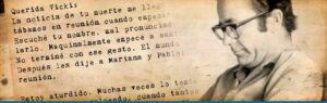“No podré despedirme, vos sabés por qué. Nosotros morimos perseguidos, en la oscuridad. El verdadero cementerio es la memoria. Ahí te guardo, te acuno, te celebro y quizá te envidio, querida mía”, escribió en la que tituló “Carta a Vicki”.