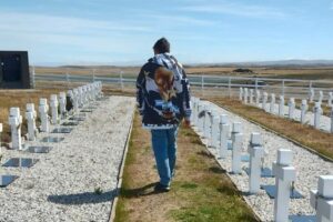 En el ahora rebautizado Puerto Stanley, tomamos el servicio de un taxista chileno, quien ofrecía la excursión al cementerio argentino. Nos habían advertido en el barco que no debíamos bajar con ropa con símbolos argentinos. Mi hija, me pidió que lleve puesto su “buzo del Campeón”, que lució Wos cuando canto en River, con imágenes de Messi y la frase “los pibes de Malvinas que jamás olvidaré”. El buzo que lleva una gran franja celeste y blanca, lo tuve que disimular con una campera, que luego me quite en el cementerio. Fue lo primero que nos advirtió el guía chileno, que los símbolos argentinos no eran bienvenidos.
